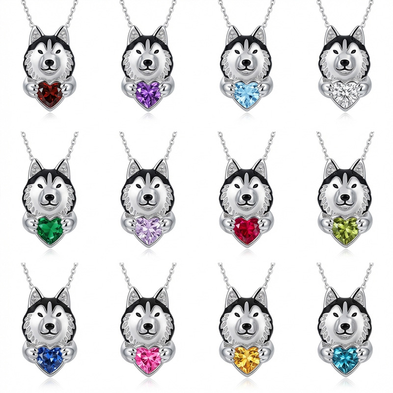 Anyes Husky Dog Embraces Love Heart Birthstone Necklace