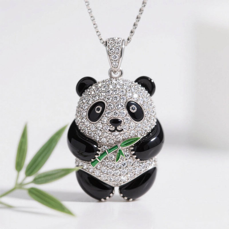Anyes Panda Holding Bamboo Black Enamel Pendant Necklace