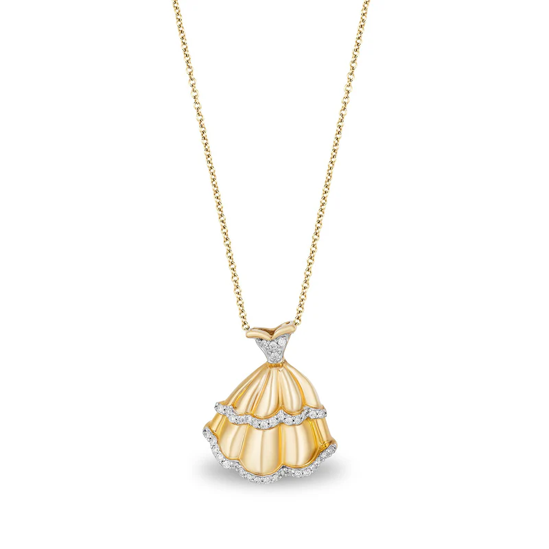 Fancy Princess's golden yellow ball gown? You can wear it now in the form of this necklace. Inspired by the beautiful dress worn by  the princess in the famous movie about the princess and the beast, here is a gorgeous pendant crafted from 18K yellow gold over sterling silver and accented with 37 round white diamonds. With this pendant in your collection, you can now dress like Belle whenever you want to.
