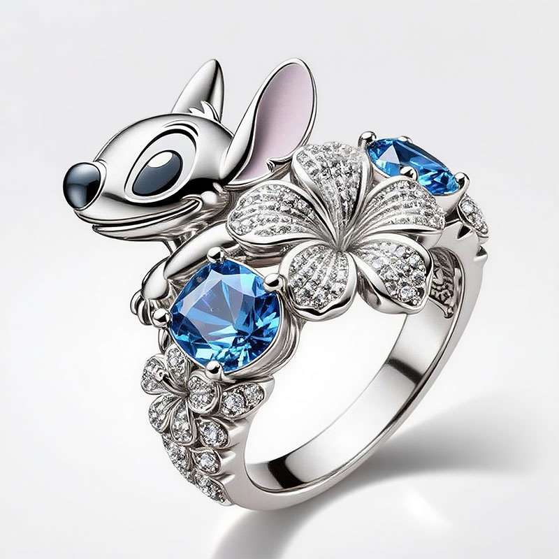 This whimsical yet elegant ring captures the little monster's rare quiet whimsy as he gazes off into the distance, resting his paw thoughtfully on the ring. Behind him, a sculpted hibiscus (Hawaii's state flower) spreads its petals, giving off a tropical vibe. Two round aquamarine blue gemstones shimmer like ocean waves in the setting, reflecting the monster's thirst for adventure. Even aliens need a vacation-let this ring remind you to chase sunsets and surf.