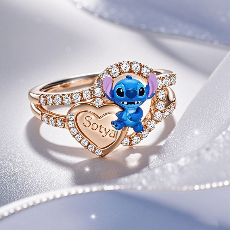 Make it uniquely yours with this adorable custom name ring, featuring everyone's favorite blue troublemaker! A playful alien stands in the center with a mischievous smile, and your name will be engraved in the heart shape next to it.